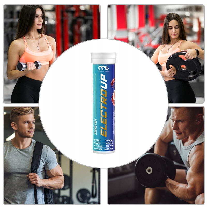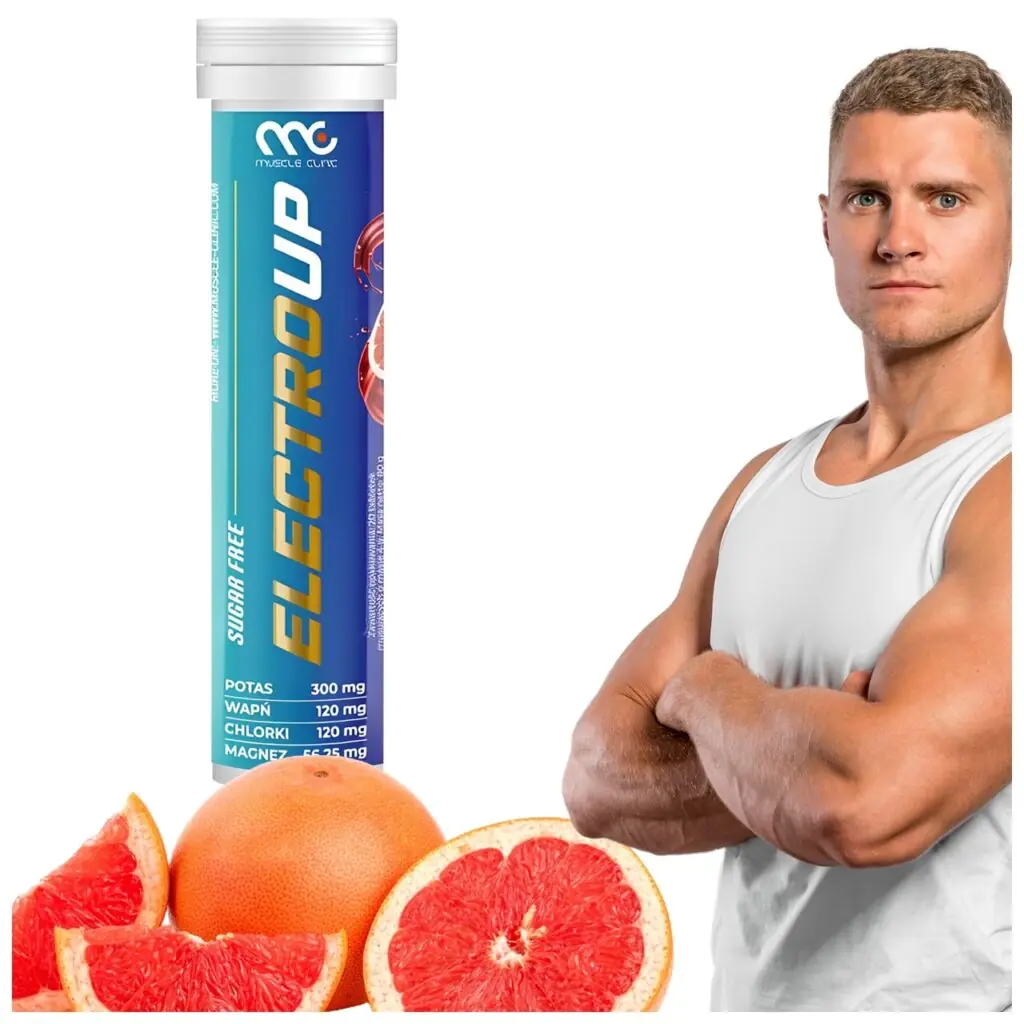 Muscle Clinic ELECTRO.UP to suplement diety w formie tabletek musujących, które szybko uzupełniają elektrolity utracone w wyniku intensywnego wysiłku fizycznego, odwodnienia, biegunki, wymiotów, nadmiernego spożycia alkoholu lub ekspozycji na wysokie temperatury. Oferują przyjemny grejpfrutowy smak bez dodatku cukru, idealny dla osób dorosłych dbających o zbilansowaną dietę i zdrowy tryb życia.