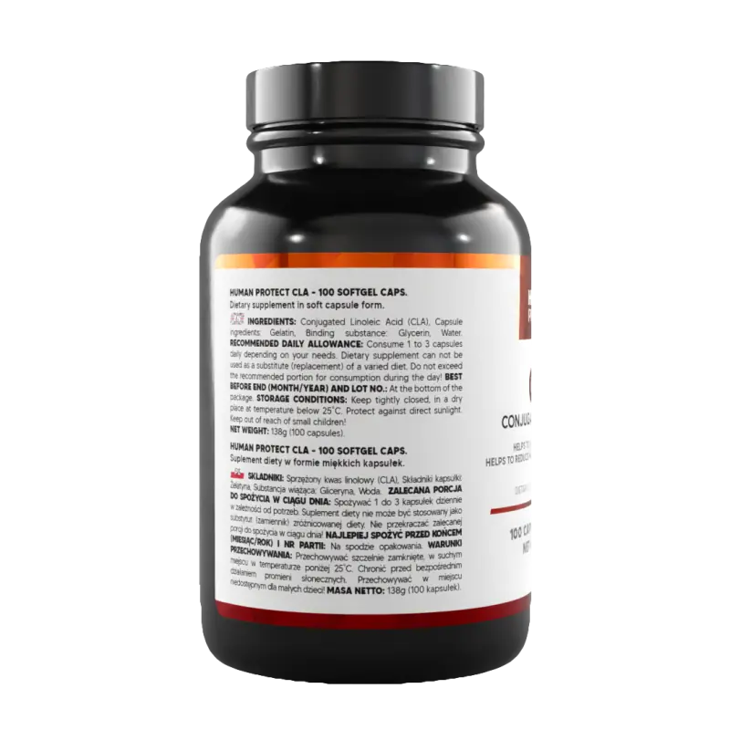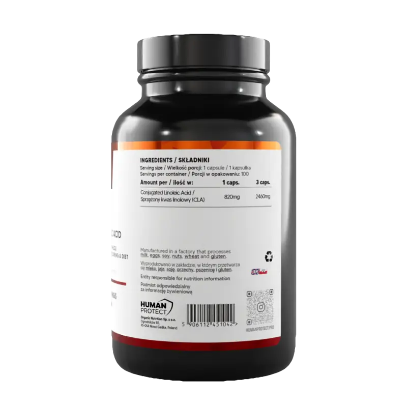 Human Protect CLA 1000mg to suplement diety zawierający sprzężony kwas linolowy (CLA), który wspiera redukcję tkanki tłuszczowej oraz wspomaga utrzymanie masy mięśniowej. CLA jest naturalnym kwasem tłuszczowym, który występuje w mięsie i produktach mlecznych, a jego suplementacja może przynieść korzyści osobom aktywnym fizycznie oraz tym, które dążą do poprawy kompozycji ciała.