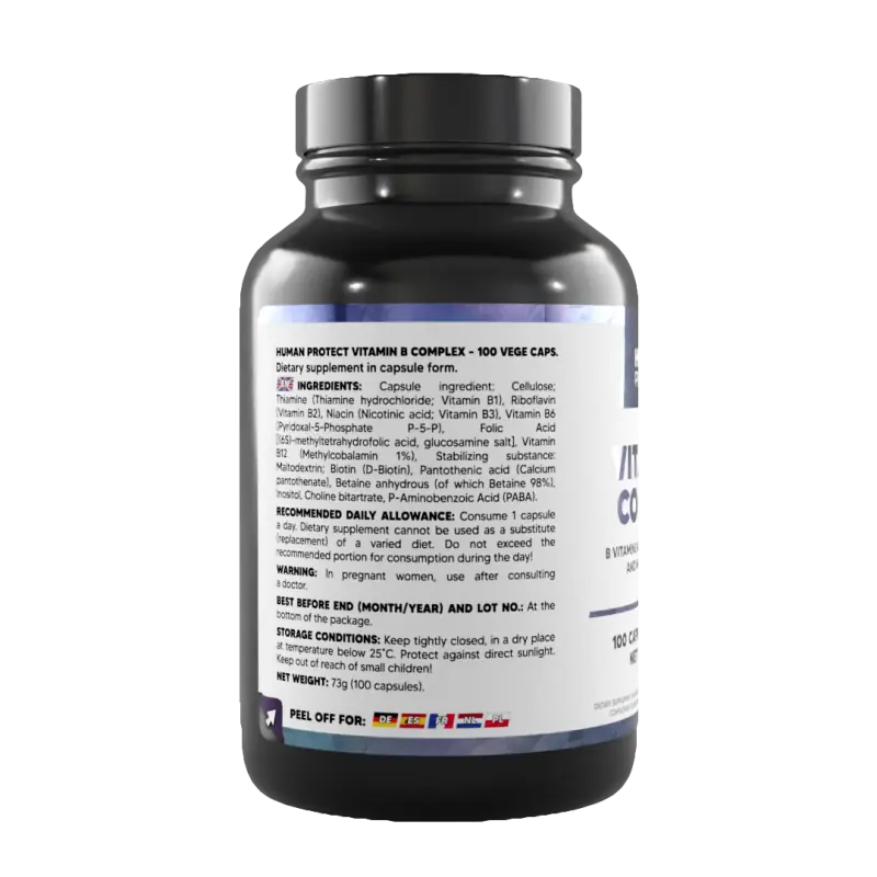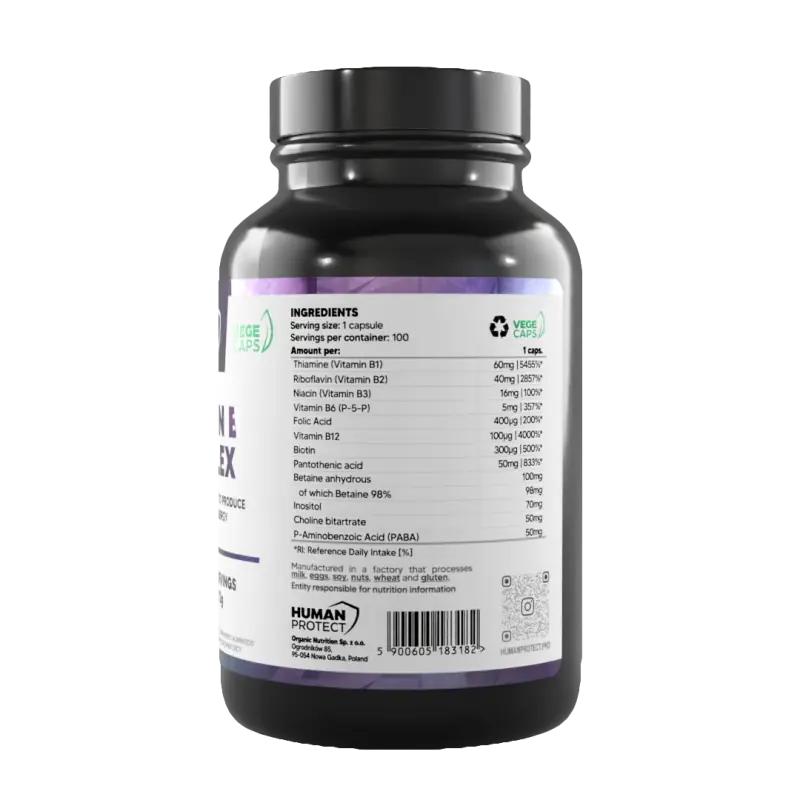 Human Protect Vitamin B Complex to zaawansowana, metylowana formuła witamin z grupy B, opracowana z myślą o maksymalnej przyswajalności i synergicznym działaniu. Każda kapsułka dostarcza biologicznie aktywne formy co gwarantuje pełną skuteczność nawet u osób z obniżoną zdolnością metylacji. Uzupełnienie o cholinę, betainę, inozytol i PABA czyni ten produkt kompletnym wsparciem dla układu nerwowego, metabolizmu i kondycji całego organizmu.