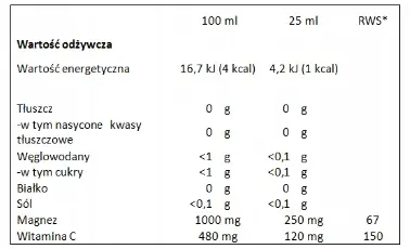- woda, magnez (cytrynian magnezu), regulator kwasowości: kwasek cytrynowy, substancja barwiąca: czerwień buraczana, witamina C (kwas L-askorbinowy), aromat naturalny wiśnia, substancja słodząca: sukraloza, substancja konserwująca: sorbinian potasu.