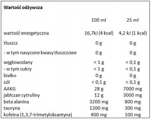 woda, AAKG (alfaketoglutaran argininy), jabłczan cytruliny, beta alanina, tauryna, aromat naturalny: opuncja, kofeina (1,3,7-trimetyloksantyna), substancja słodząca: sukraloza, substancja konserwująca: sorbinian potasu.