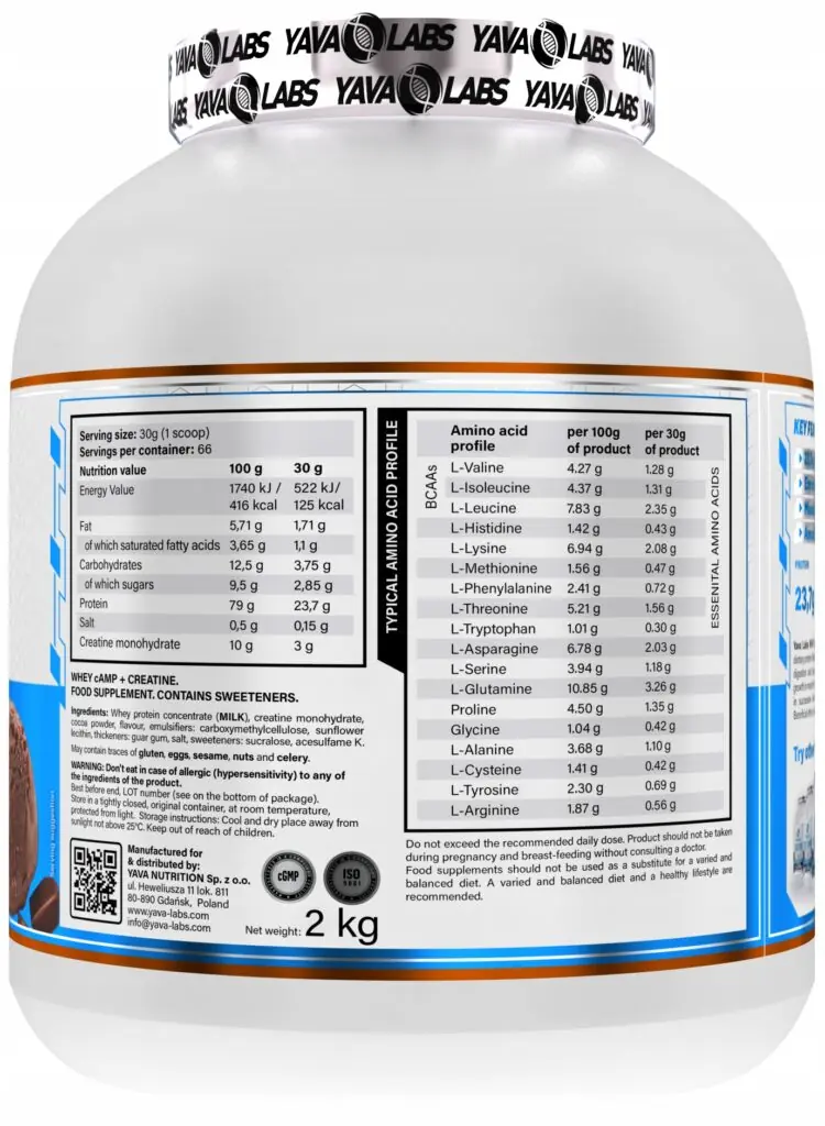 YAVA LABS – Whey camp creatine zawierające 23,7 g białka w 1 porcji, zapewniające dzienne zapotrzebowanie na białko z wysokiej jakości źródła.